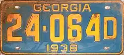 1935 | Dark blue on orange with border line; "1935" and "GEORGIA" at top and bottom respectively | none | 12-345A | Coded by weight class (A) | |