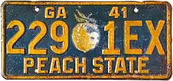 1941 | Reflective yellow on dark blue with border line; peach sticker in the center; "GA 41" at top | "PEACH STATE" at bottom | 123-45A 123-4EX |
