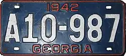 1942–43 | White on dark blue with red border line; "1942" and "GEORGIA" in red at top at bottom respectively | none | A12-345 EX12345 |