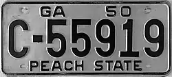 1950 | Black on unpainted aluminum with border line; "GA 50" at top | "PEACH STATE" at bottom | A-12345 E/X-12345 E/S-12345 |