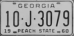 1960 | Black on white with border line; "GEORGIA" centered at top; "19" at bottom left and "60" at bottom right | "PEACH STATE" centered at bottom | 1·12345 1·A·12345 10·1234 10·A·1234 100·1234 100·A·123 |