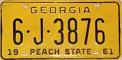 1961 | Black on yellow with border line; "GEORGIA" centered at top; "19" at bottom left and "61" at bottom right | "PEACH STATE" centered at bottom | 1·12345 1·A·12345 10·1234 10·A·1234 100·1234 100·A·123 |