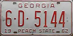 1962 | Red on white with border line; "GEORGIA" centered at top; "19" at bottom left and "62" at bottom right | "PEACH STATE" centered at bottom | 1·12345 1·A·12345 10·1234 10·A·1234 100·1234 100·A·123 |