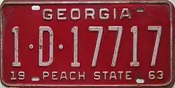 1963 | White on red with border line; "GEORGIA" centered at top; "19" at bottom left and "63" at bottom right | "PEACH STATE" centered at bottom | 1·12345 1·A·12345 10·1234 10·A·1234 100·1234 100·A·123 |