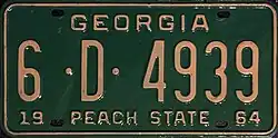 Georgia used two sets of numeric county codes on its license plates between 1957 and 1970. On both sets, the order of the codes was based on the respective populations of each county, with the order of the codes from 1962 onwards based on the figures according to the 1960 United States census.[5][6]