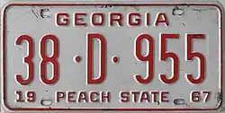 1967 | Red on white with border line; "GEORGIA" centered at top; "19" at bottom left and "67" at bottom right | "PEACH STATE" centered at bottom | 1·12345 1·A·12345 10·1234 10·A·1234 100·1234 100·A·123 |