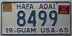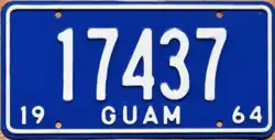 1964 | Embossed white on blue with border line; "19 GUAM 64" at bottom | 12345 | 1 to approximately 17500 |