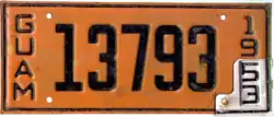 1950–51 | Embossed orange on black with border line; "GUAM" at left and "1950" at right | 1234 | 1 to approximately 9900 | Revalidated for 1951 with silver tabs. |