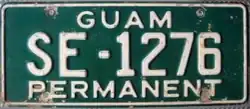 1955–56 | Embossed white on dark green with border line; "GUAM" at left and "1955" at right | 12345 | 1 to approximately 14000 | Revalidated for 1956 with black tabs. |