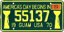 1970–73 | Embossed golden yellow on dark green with border line; latte stone graphics at left and right | America's Day Begins In Guam USA | 12345 | 1 to approximately 55200 | |