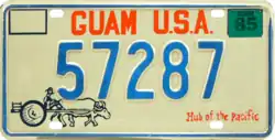 1983–86 | Embossed blue on reflective white with border line; ox cart graphic at bottom left | Hub of the Pacific | 12345 | 1 to approximately 87000 | |