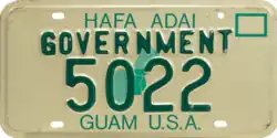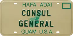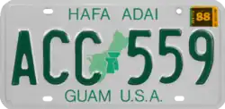 1986–93 | Embossed dark green on reflective white; graphic in center featuring pale green map and two green latte stones | Hafa Adai | ABC 123 | AAA 001 to approximately AFN 999 | |