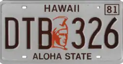1981–90 | Embossed brown on reflective white; orange warrior head graphic screened in center; "HAWAII" screened in brown centered at top; "81" screened at top right | "ALOHA STATE" screened in brown centered at bottom | ABC 123 | County-coded (see right) | Honolulu County used A, B, C and D as the first letter; Hawaii County used H; Maui County used M; and Kauai County used K. Letters I, O and Q not used, and H, K, L and M not used in Honolulu County; these practices continue today.[1][4][5] |