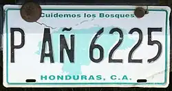 Honduran license plates are white and feature an outline of the map of Honduras in a variety of colors according to the class of vehicle registered. All license plates bear the slogan Cuidemos los Bosques ("Take Care of the Forests") along the top, and "Honduras, C.A." along the bottom. They are the same size as North American license plates, 6 by 12 inches.[1]