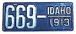 1913 | Embossed white serial on blue plate; "IDAHO 1913" at right | none | 1234 | 1 to approximately 2500 | |