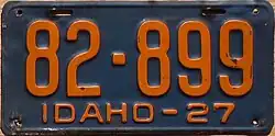 1927 | Embossed orange serial on dark blue plate, "IDAHO–27" at bottom | none | 12-345 | 1 to approximately 95-000 | |