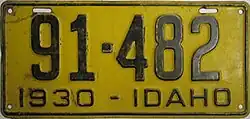 1930 | Embossed black serial on golden yellow plate with border line; "1930 - IDAHO" at bottom | none | 123-456 | 1 to approximately 112-000 | |