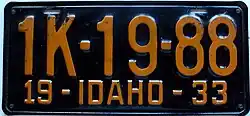 1933 | Embossed orange serial on black plate; "19 - IDAHO - 33" at bottom | none | 1A-12-34 | Coded by county of issuance (1A) | |