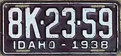 1938 | Embossed white serial on maroon plate with border line; "IDAHO - 1938" at bottom | none | 1A-12-345 | Coded by county of issuance (1A) | |