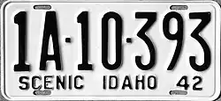 1942–44 | Embossed dark blue serial on white plate; "42" at bottom right | "SCENIC IDAHO" at bottom, offset to left | 1A-12-345 | Coded by county of issuance (1A) | Revalidated for 1943 and 1944 with windshield stickers, due to metal conservation for World War II. |