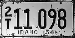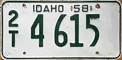 In 1956, the United States, Canada, and Mexico came to an agreement with the American Association of Motor Vehicle Administrators, the Automobile Manufacturers Association and the National Safety Council that standardized the size for license plates for vehicles (except those for motorcycles) at 6 inches (15 cm) in height by 12 inches (30 cm) in width, with standardized mounting holes.[1] The 1956 (dated 1957) issue was the first Idaho license plate that fully complied with these standards: the issues from 1952 through 1955 (dated 1953 through 1956) were all 6 inches in height by 12 inches in width, but had non-standard mounting holes.