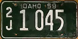 | 1959 | Embossed white serial on dark green plate with border line; "IDAHO 59" centered at top | "FAMOUS POTATOES" centered at bottom | A 12345 0/A 12345 |
