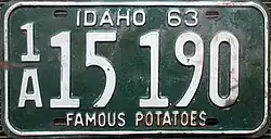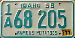 1968–70 | Embossed green serial on white plate with border line; "IDAHO 68" centered at top | "FAMOUS POTATOES" centered at bottom | A 12345 0/A 12345 1/A A1234 |