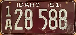 1951–52 | Embossed white serial on maroon plate with border line; "IDAHO 51" centered at top | none | A 12345 0/A 12345 |