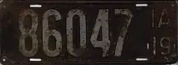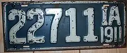 The U.S. state of Iowa first required its residents to register their motor vehicles in 1904. Registrants provided their own license plates for display until 1911, when the state began to issue plates.[1]