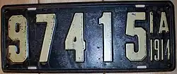 1914 | Embossed white serial on black plate; "IA 1914" at right | none | 123456 | 6001 to approximately 112000 | |