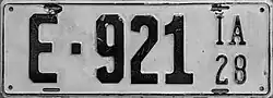 | 1928 | Embossed black serial on white plate with border line; "IA 28" at right | none | A-12345 1-1234 10-1234 |