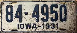 1931 | Embossed dark blue serial on white plate with border line; "IOWA-1931" centered at bottom | none | 1-12345 10-12345 |