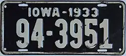 1933 | Embossed white serial on dark blue plate with border line; "IOWA-1933" centered at top | none | 1-12345 10-12345 |