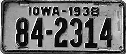 1938 | Embossed dark blue serial on white plate with border line; "IOWA-1938" centered at top | none | 1-12345 10-12345 |