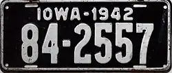 1942–44 | Embossed white serial on black plate with border line; "IOWA-1942" centered at top | none | 1-12345 10-12345 |