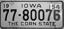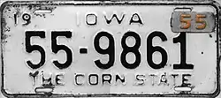1953–55 | Embossed black serial on white plate with border line; "IOWA" centered at top; "19" at top left and "53" at top right | "THE CORN STATE" centered at bottom | 1-12345 10-12345 |