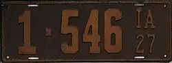 1927 | Embossed orange serial on dark blue plate with border line; "IA 27" at right | none | A-12345 1-1234 10-1234 |
