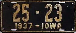 1937 | Embossed white serial on dark blue plate with border line; "1937-IOWA" centered at bottom | none | 1-12345 10-12345 |