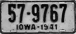 1941 | Embossed black serial on white plate with border line; "IOWA-1941" centered at bottom | none | 1-12345 10-12345 |