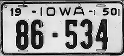 1950–51 | Embossed black serial on white plate with border line; "IOWA" centered at top; "19" at top left and "50" at top right | none | 1-12345 10-12345 |