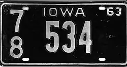 1963 | Embossed white serial on black plate with border line; "IOWA" centered at top; "63" at top right | none | 1 12345 1/0 123456 |