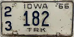 Truck | 1966 | Embossed dark blue lettering on a white background, "IOWA" in center at top "TRK" in center at bottom |
