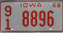 1968 | Embossed red serial on reflective white plate with border line; "IOWA" centered at top; "68" at top right | none | 1-12345 1/0 123456 |