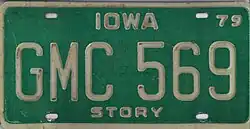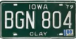 1979 – December 1984 | Reflective white serial on green plate with border line; "IOWA" and county name centered at top and bottom respectively; "79" at top right; all embossed. Plate elements either embossed (above) or debossed (below) | county name | ABC 123 | AAA 000 to approximately KCZ 999 | County codes abolished after 57 years, replaced by county names at bottom of plate. Whether the plate was embossed or debossed depended on the county of issuance. The serial blocks initially assigned were the same as those on the 1975–78 base. Non-resident plates had blank bottoms. |