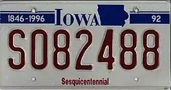 | Sesquicentennial (Scenic) | 1992 | Embossed red serial on reflective graphic plate with pale blue sky, green grass, pale green tree and blue city skyline; "IOWA" screened in red at top, offset to right; "SESQUICENTENNIAL 1846 * 1996" (in two lines) screened in black to left; "92" screened at top right | 123456S | 000001S to approximately 130000S |