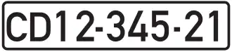 Diplomatic Corps/Consular Corps registration plates are rectangular with white background and embossed with black registration number. Diplomatic/Consular Corps registration numbers consist of the letters CD/CC (respectively) and seven digits—the last two of them are 21 or 22. Private vehicles owned by a member of a diplomatic/consular mission and originally brought from the member's country of origin do not carry the letters CD/CC, but the last two digits remain 21 or 22. Honorary consuls' vehicles carry plates consisting of the letters CC without the final digits of 21 or 22, even though the vehicle is registered under a civil registration number.