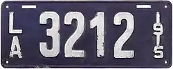 1917 | Embossed dark blue serial on white plate; stylized "LA" and "17" at left | none | 12345 | 1 to approximately 27000 | |