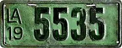 1919 | Embossed black serial on light green plate with border line; stylized "LA" and "19" at left | none | 12345 | 1 to approximately 50000 | |