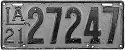 1921 | Embossed black serial on gray plate with border line; stylized "LA" and "21" at left | none | 12345 | 1 to approximately 79000 | |