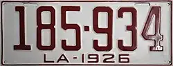 Embossed maroon serial on white plate with border line; "LA-1926" centered at bottom | none | 40-001 to 200-000 | |||